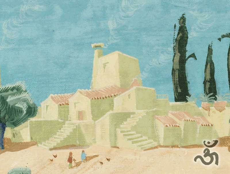 Hier siehst Du einen (kleinen) Ausschnitt aus dem Bild. Es stellt eine liebevoll ausgestaltete orientalische Landschaft dar, wie wolfgangFRIES sie sich vorgestellt hat. Er war nie in Vorderasien oder im Orient, hatte aber ein Faible für die Kulturen in diesen Landstrichen.